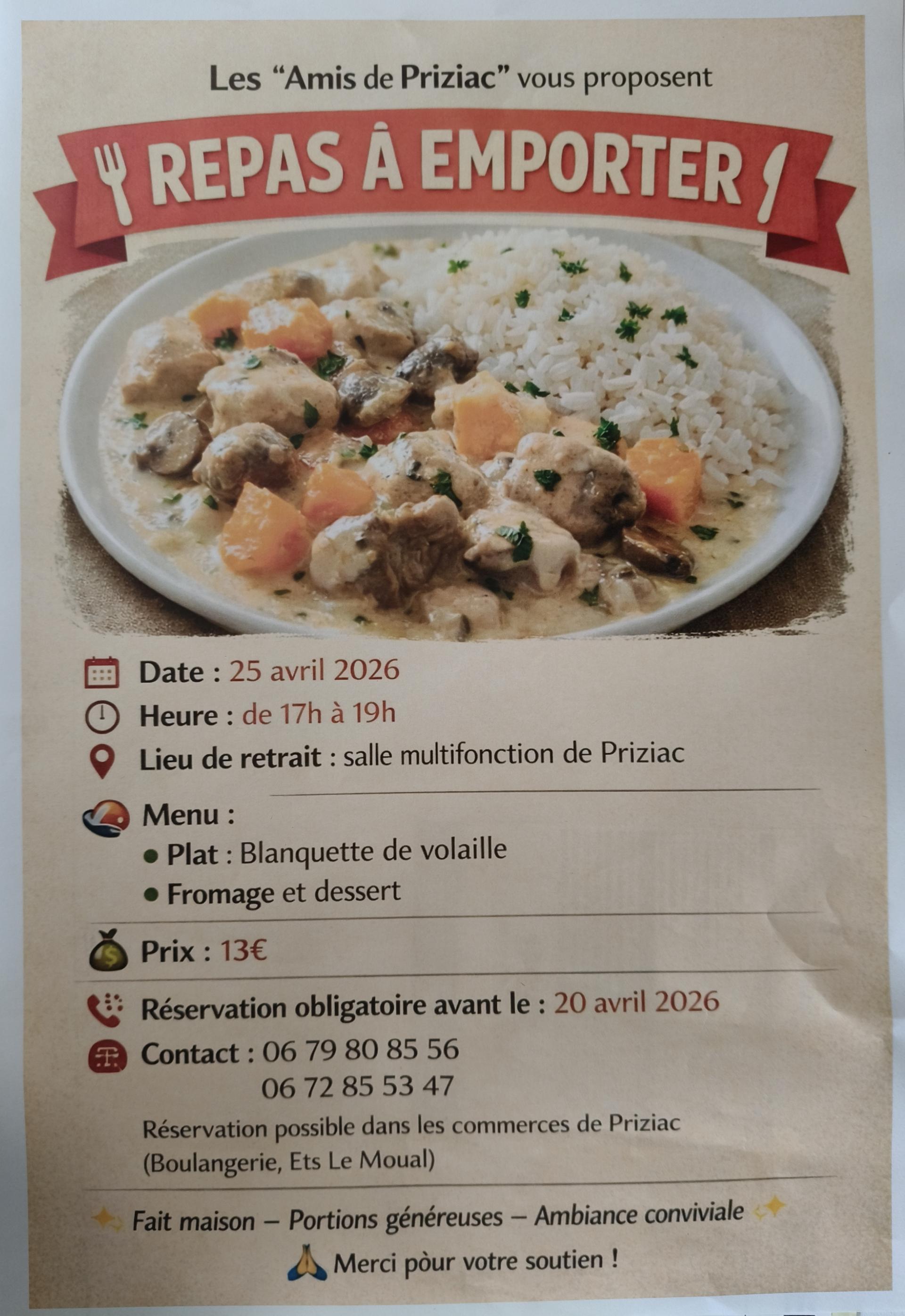 L'association "Les Amis de Priziac" organise son repas à emporter (plat+fromage+dessert) samedi 25 avril. Les commandes sont à passer pour le lundi 20 avril auprès des membres de l'association ou dans les commerces (à la boulangerie Au Panier Gourmand et aux Ets Le Moual - Proxi Confort). Les commandes seront à retirer de 17h à 19h à la salle multifonction.